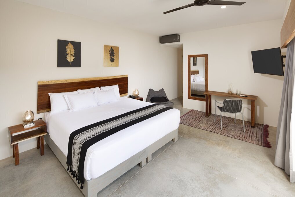 This 45-square-meter room features a contemporary coastal style, a large balcony (or terrace) with panoramic garden views, Alexa Assistant, a 43-inch smart TV, and a king-size bed and minibar. The bathroom has wooden doors, round sinks and ample closet space.